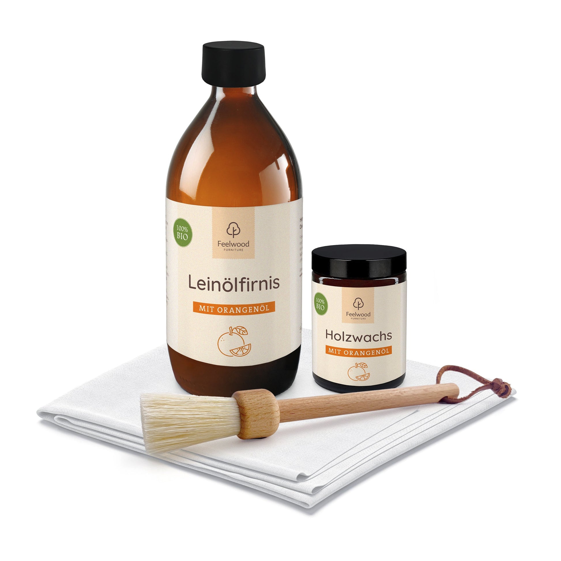 Das biologische Holzpflege Set für Möbel und Holzprodukte mit Lebensmittelkontakt! Bio-Leinölfirnis mit Orangenöl im Set mit Bio-Holzpflegewachs, handgefertigtem Öl-Pinsel aus Naturmaterialien und Baumwoll-Pflegetuch. Für beanspruchte Naturholz-Möbel, Holzspielzeuge, Schneidebretter, Messergriffe, Esstische, Küchenarbeitsplatten u.v.m. 100% natürlich und lebensmittelecht. Auch als nachhaltiges Geschenk für Holzliebhaber eine tolle Idee!